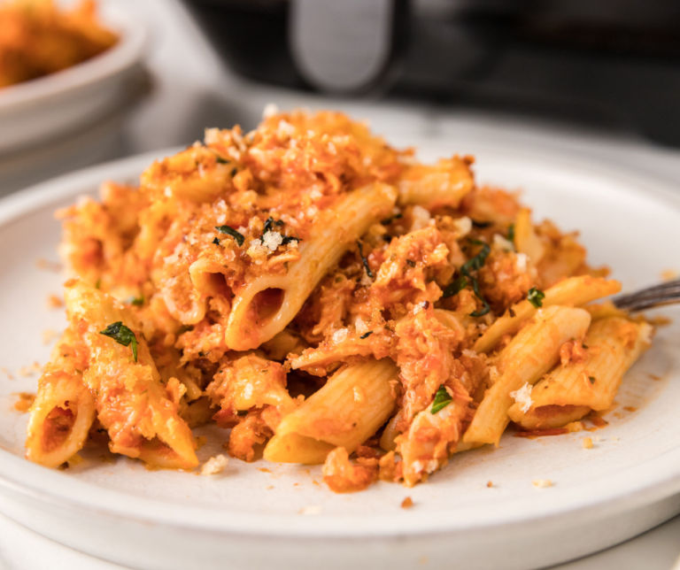 Pasta, marinara, cheese, and pepperoni come together in this pizza-style bake. It’s cheesy, saucy, and finished with a crispy cheese topping. The air fryer melts everything together quickly. Serve with garlic knots or a green salad.