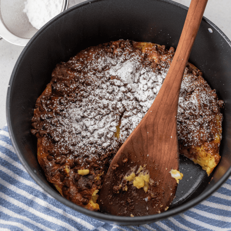 Cubes of bread are soaked in custard and studded with chocolate chips. The air fryer cooks it to a soft, custardy center with a crisp top. It’s sweet enough for dessert but works for brunch too. Top with syrup or powdered sugar.
