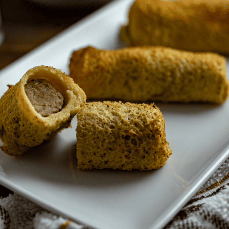 Sausage links are wrapped in French toast and cooked until golden. They’re sweet and savory in every bite. Great for dipping in syrup. A hearty breakfast option.