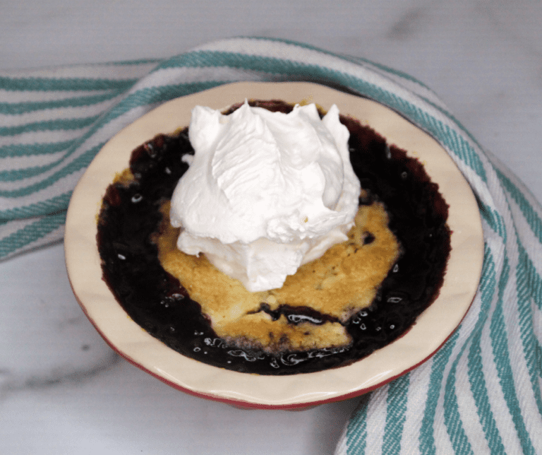 Blueberry filling cooked under pressure with a biscuit or dumpling topping. It’s quick and keeps moisture locked in. The topping rises into steam pockets over the fruit. Serve warm with a spoonful of topping and fruit.