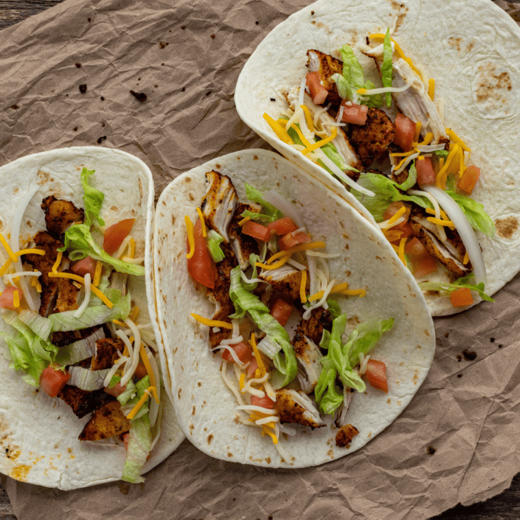 Small tortillas filled with chopped air-fried chicken and toppings. Quick to assemble and full of flavor. Use salsa, slaw, or avocado. Great for a casual dinner.