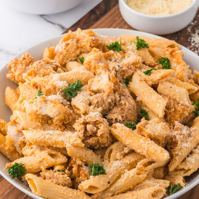 Creamy pasta meets chunks of crispy air-fried chicken. The top layer gets golden while the inside stays soft. It’s cheesy, comforting, and easy to portion. Use rotisserie chicken for shortcuts.