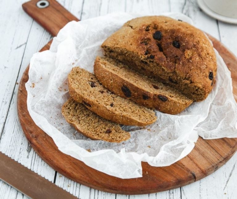 A rustic loaf made with baking soda instead of yeast. It’s crusty on the outside and slightly crumbly inside. Raisins or currants add a touch of sweetness. Serve warm with butter and a hot drink.