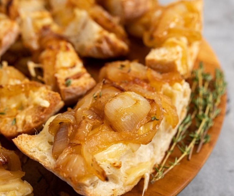 Caramelized onions and melted cheese are layered over bread for a savory treat. It’s like French onion soup in sliceable form. The cheese bubbles and browns beautifully in the air fryer. Serve as an appetizer or with a bowl of soup.