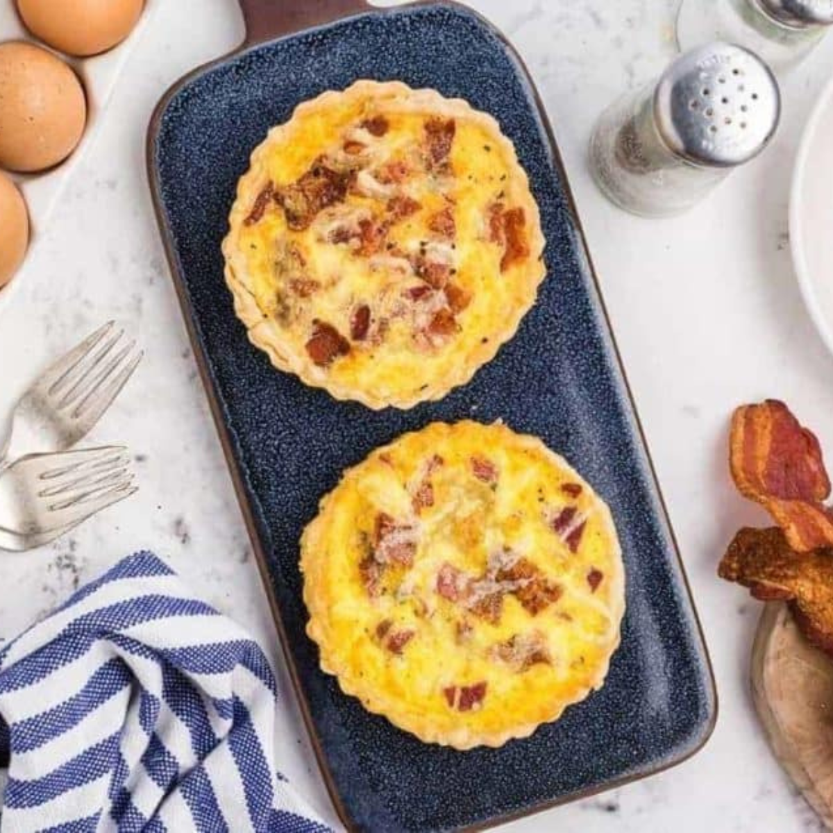 two personal sized quiches on a blue serving board