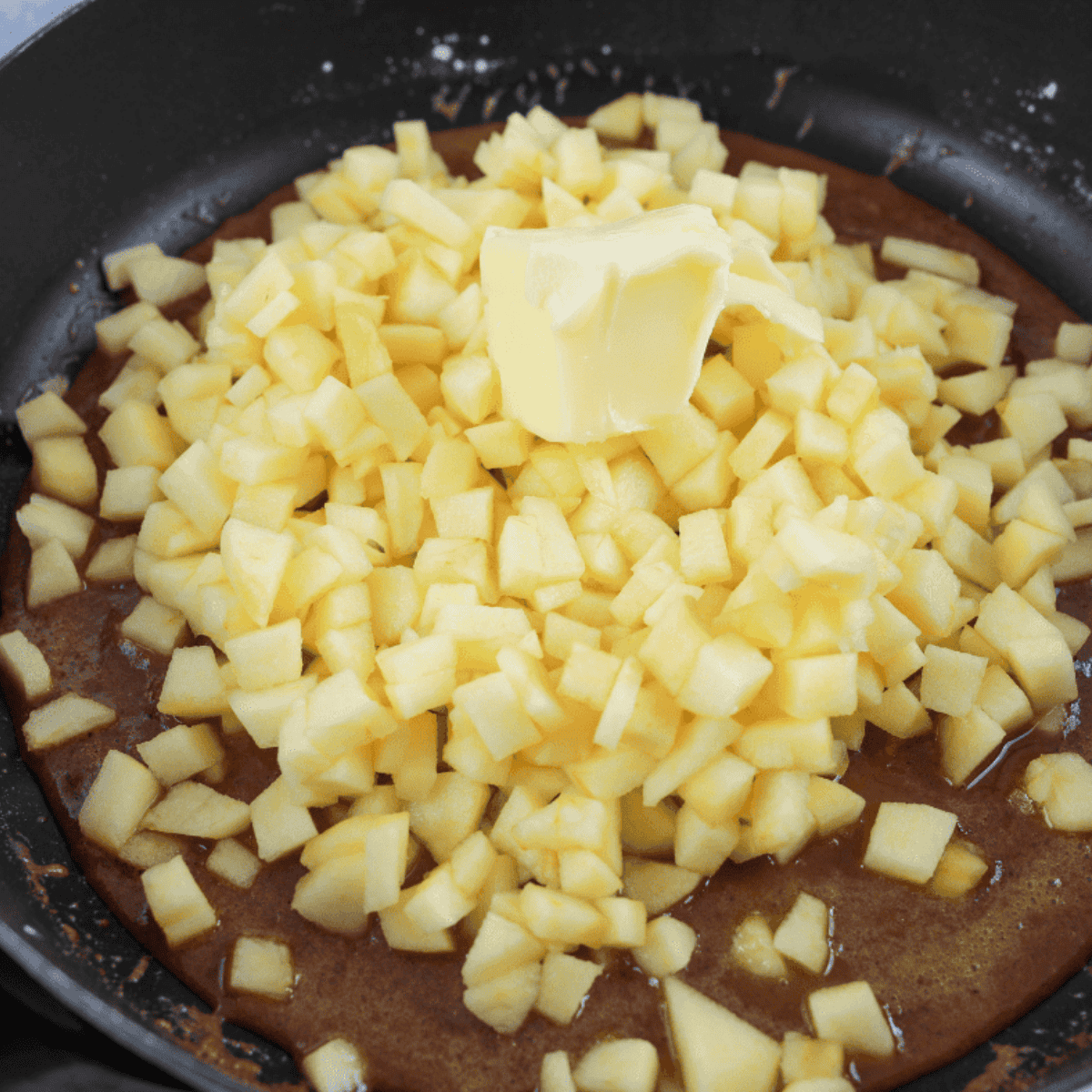 Step 1: Peel and dice the apples into bite-sized pieces. In a small saucepan, combine sugar, cornstarch, cinnamon, nutmeg, allspice, and water, then stir well. Heat until just simmering, then remove from heat and stir in butter, apples, and lemon juice.