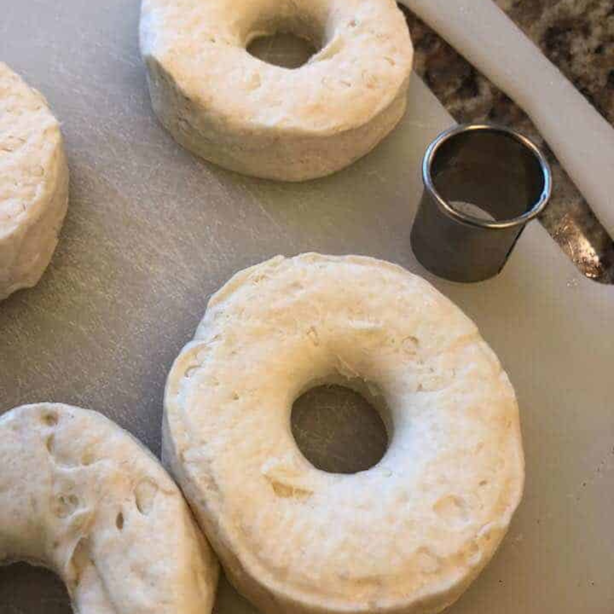 - Use your biscuit cutter or a bottle cap, and cut the center of the biscuit out. Repeat until all of the biscuits are done