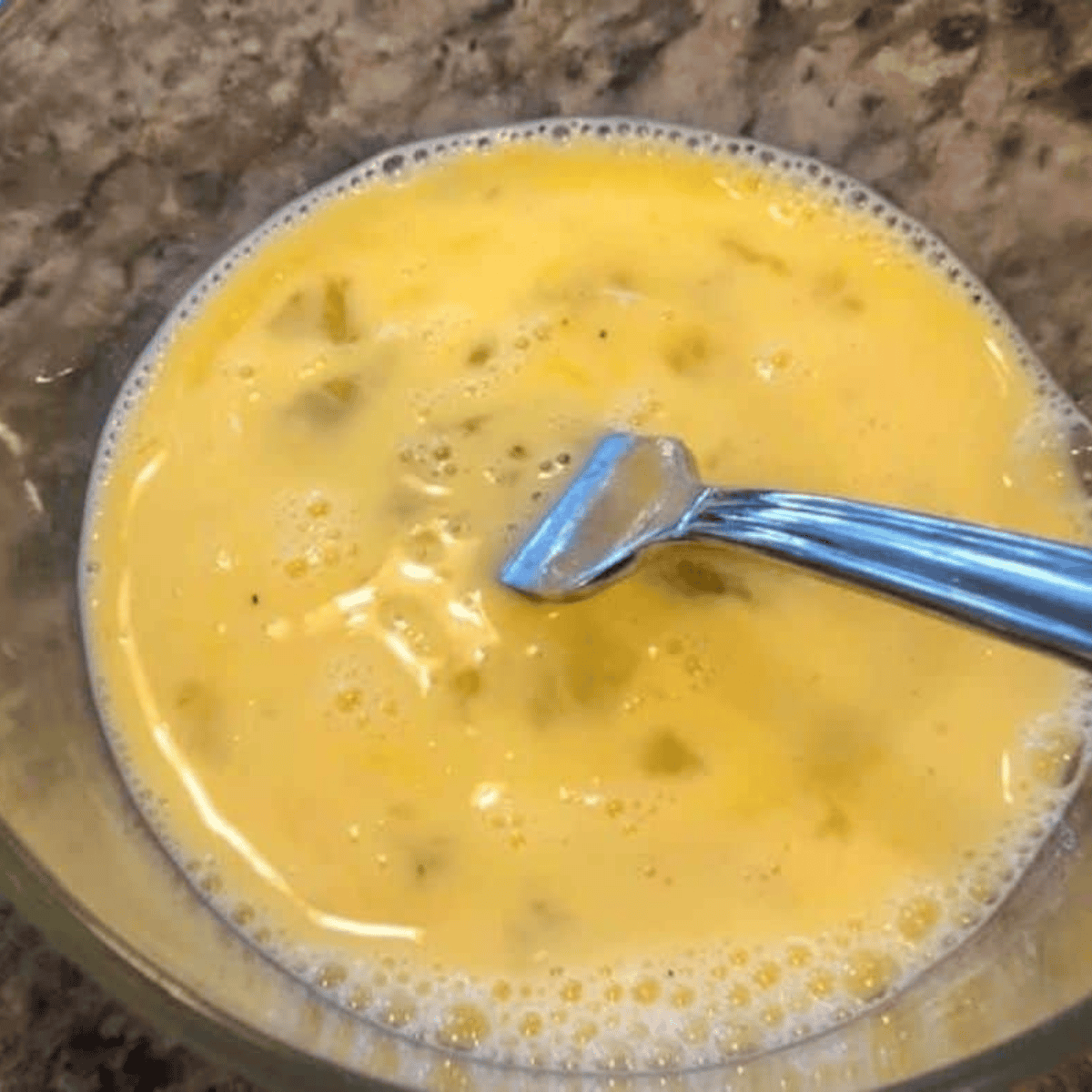 - Dice your bell peppers and cooked ham. Mix everything, the eggs, milk, salt, black pepper, bell peppers, shredded cheese, and ham.