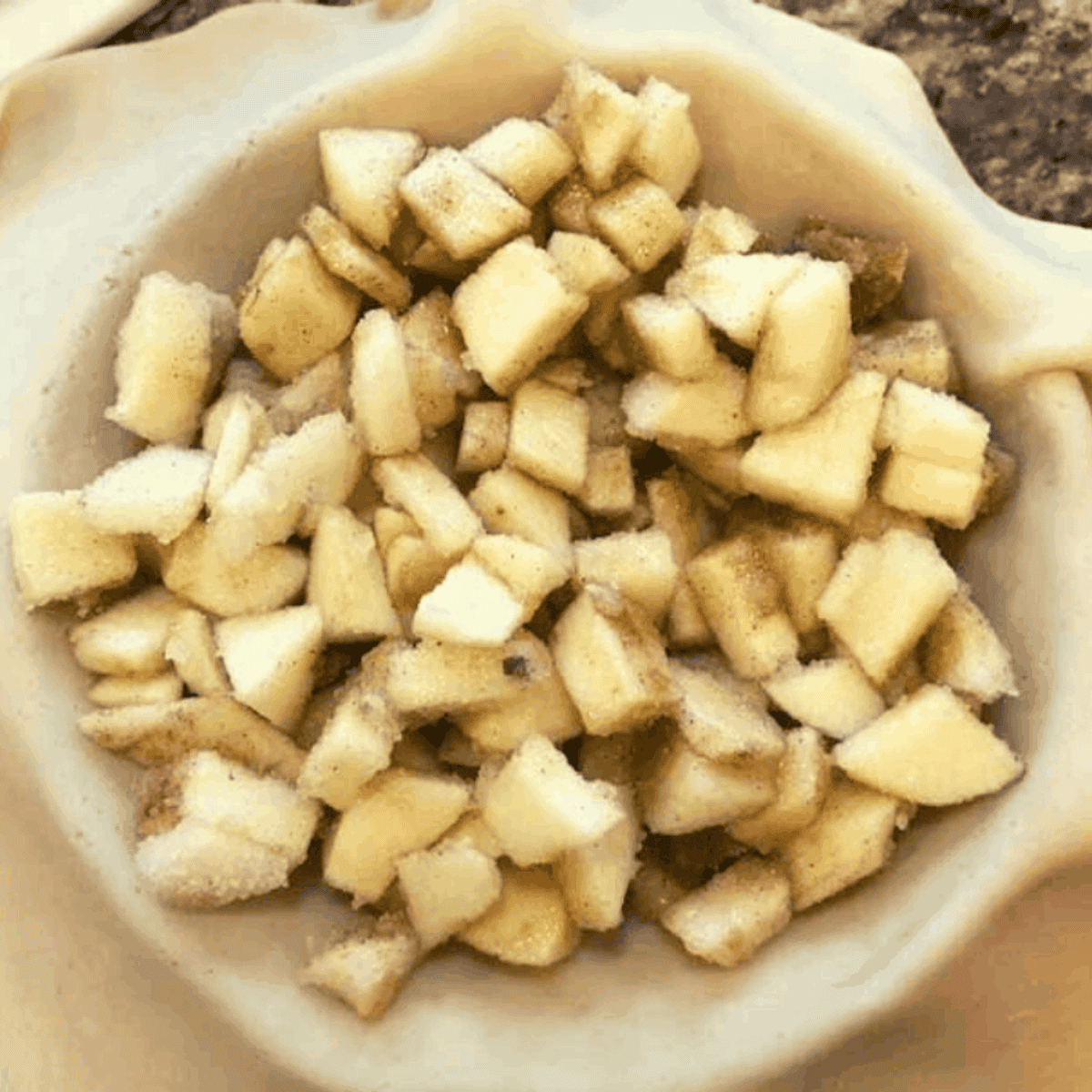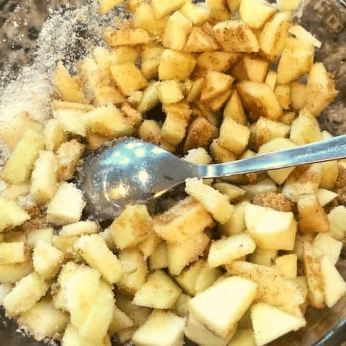 - Mix the diced 3 apples 1/2 cup sugar, 2 teaspoons ground cinnamon, 1/2 teaspoon ground nutmegand 2 tablespoons brown sugar in a small mixing bowl.
