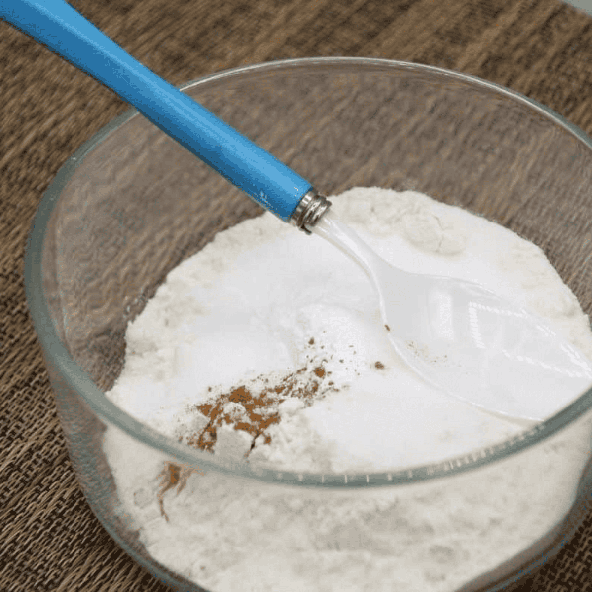 Step One: In a small mixing bowl, add the flour, sugar, baking powder, and ground cinnamon, and mix well.