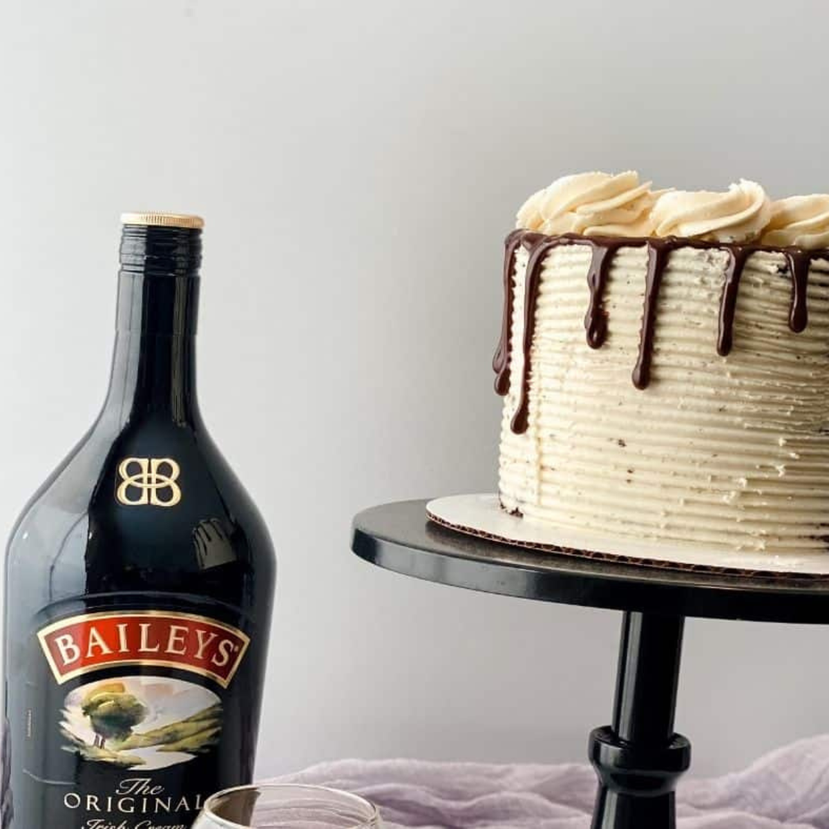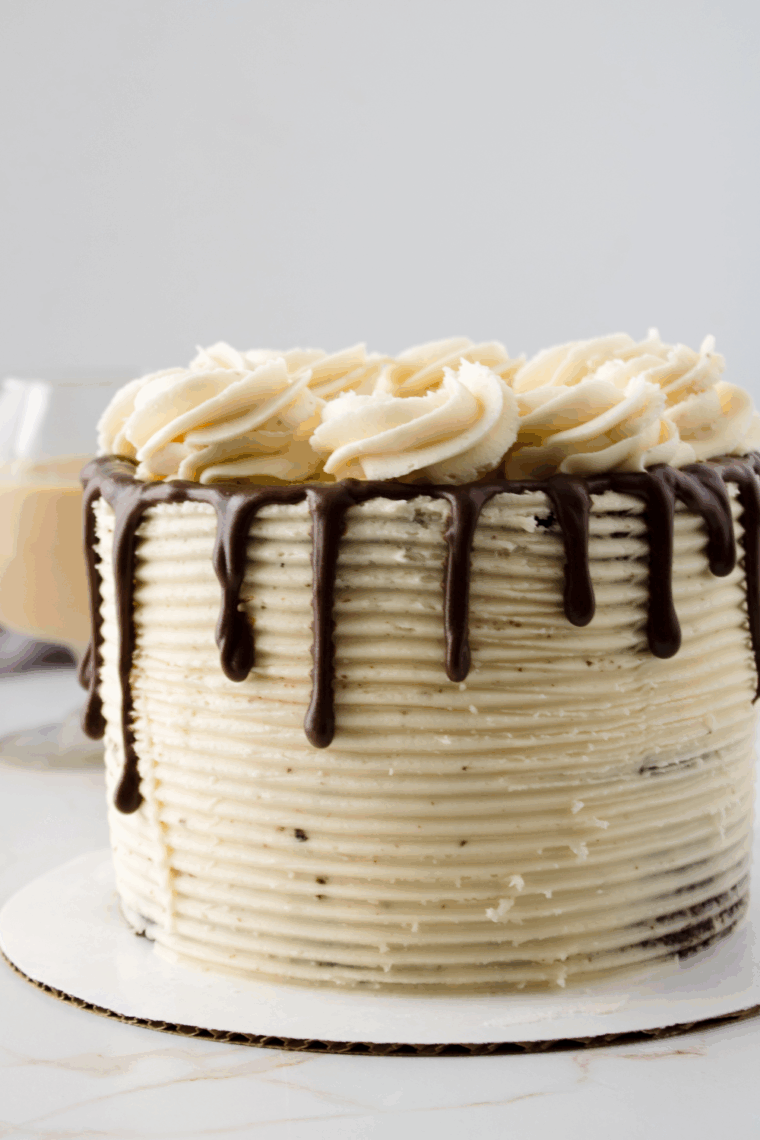 - Place extra frosting back into the bowl; there should be no crumbs in the icing.Fit a piping bag with a tip 1M, add the leftover icing to the piping bag, and set to the site.Add the Baileys chocolate ganache to a piping bag in a pourable consistency. Cut a small hole at the tip of the bag and pipe a series of drips around the cake. Let set for 3-4 mins. Pipe 4 rosettes at the 12, 3, 6 & 9 o’clock points on the top of the cake.Add a rosette in between those.