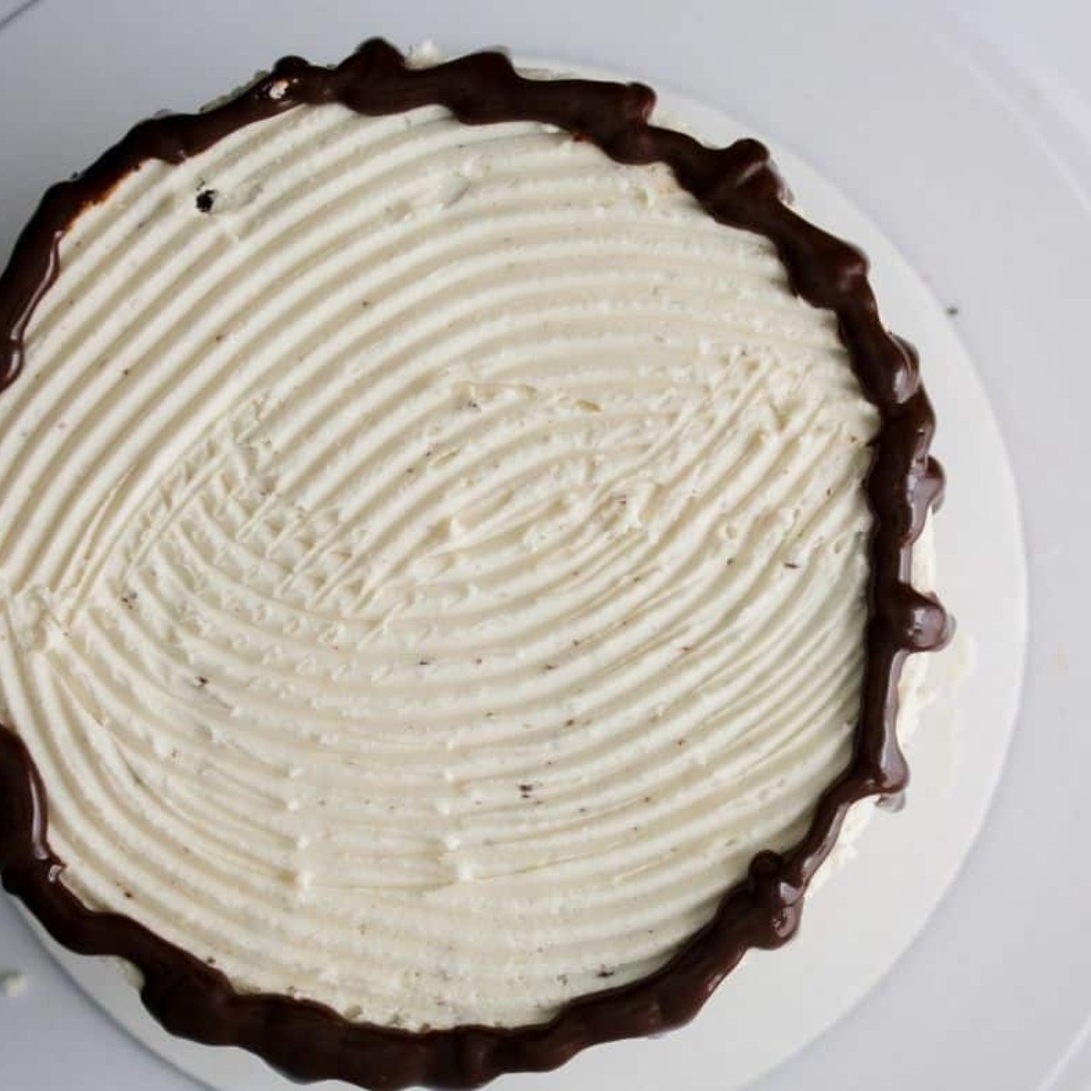 Step Seven: Use the first scoop of frosting as your base and rotate the cake on the turntable, icing all the way around. Don’t worry about perfection at this stage. Once the cake is chilled, run a cake comb around the sides to create a spiral design and scrape away any extra frosting.