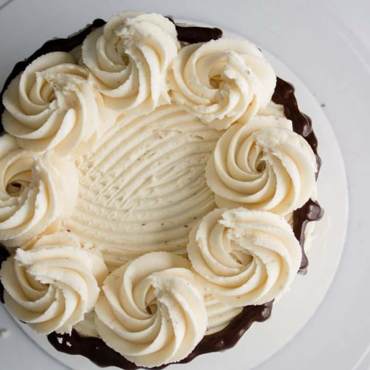 Step Eight: Return any leftover frosting to the bowl, making sure it’s free of crumbs. Fit a piping bag with a 1M tip and fill it with the frosting. Pour the Baileys chocolate ganache into a separate piping bag with a small cut at the tip and pipe drips around the edge of the cake, letting them set for 3–4 minutes. Pipe four rosettes at the 12, 3, 6, and 9 o’clock positions, then fill in the gaps with additional rosettes.