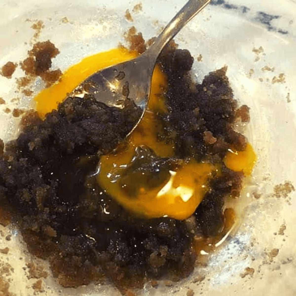 - In a small mixing bowl, mix the melted 6 tablespoons butter, 1 cup dark brown sugar, 2 large egg yolks 1 teaspoon pure vanilla extract and 1/2 teaspoon salt Mix well.