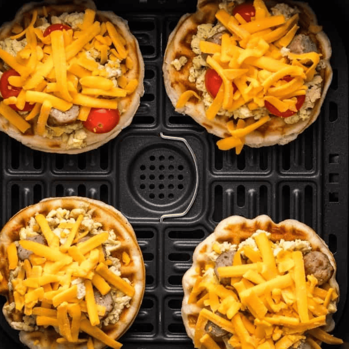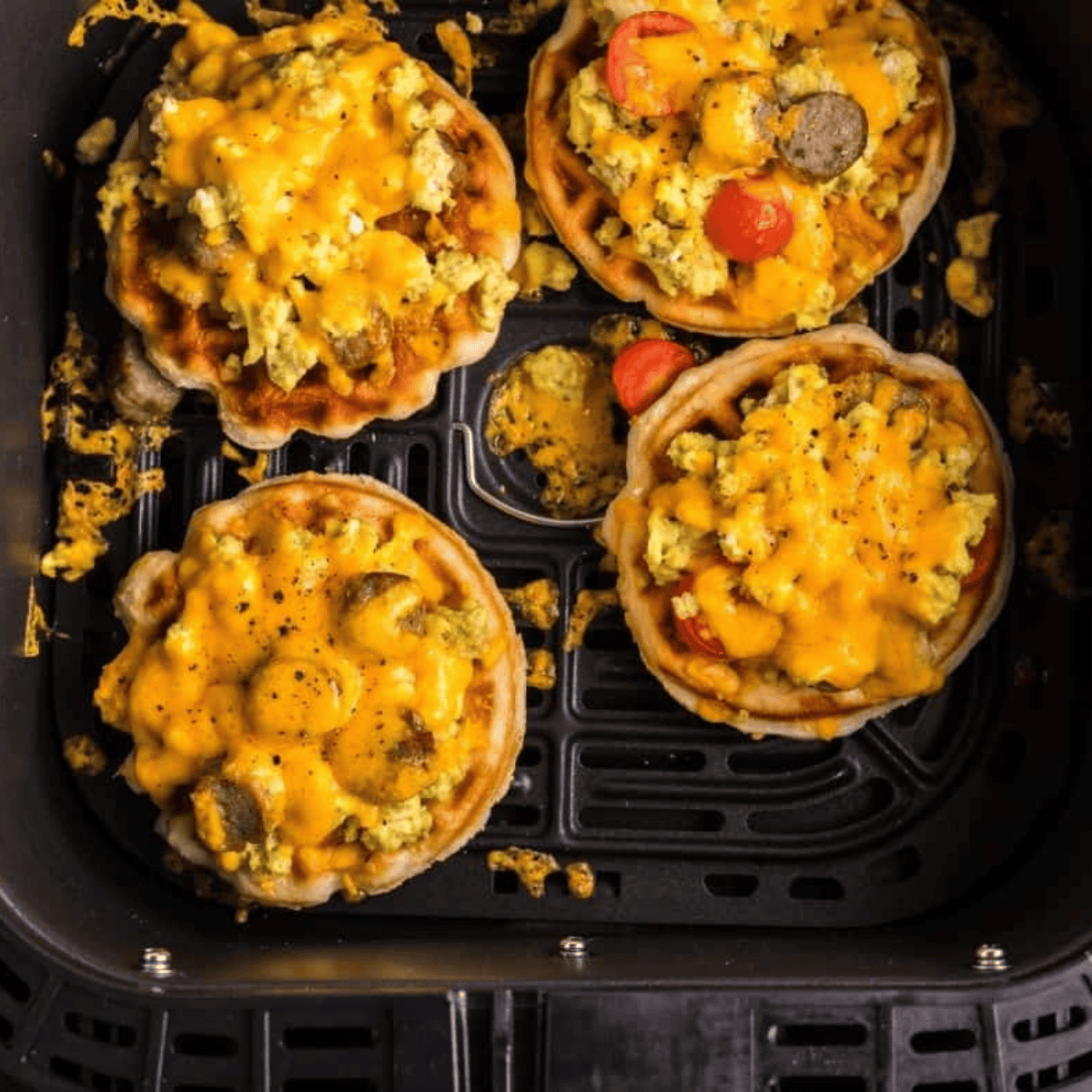 Step Three: Preheat the air fryer to 380 degrees F, for 3-5 minutes. Top each waffle with scrambled eggs, sausage, and cherry tomatoes. Cover with cheese.
