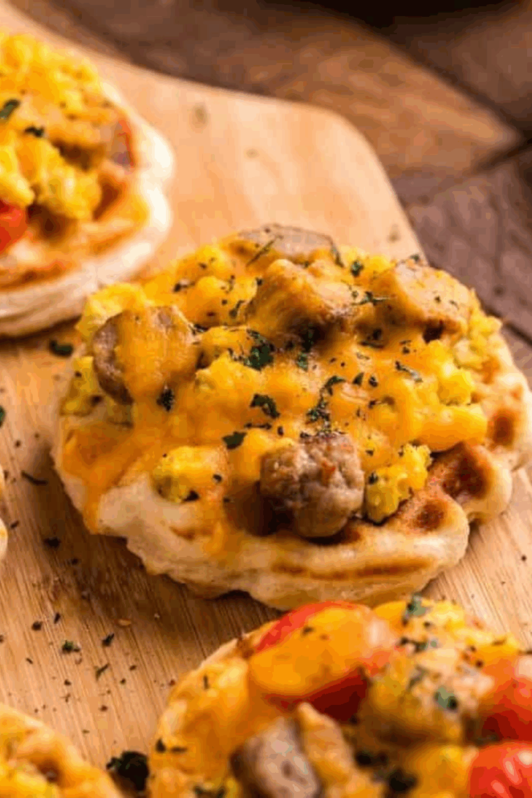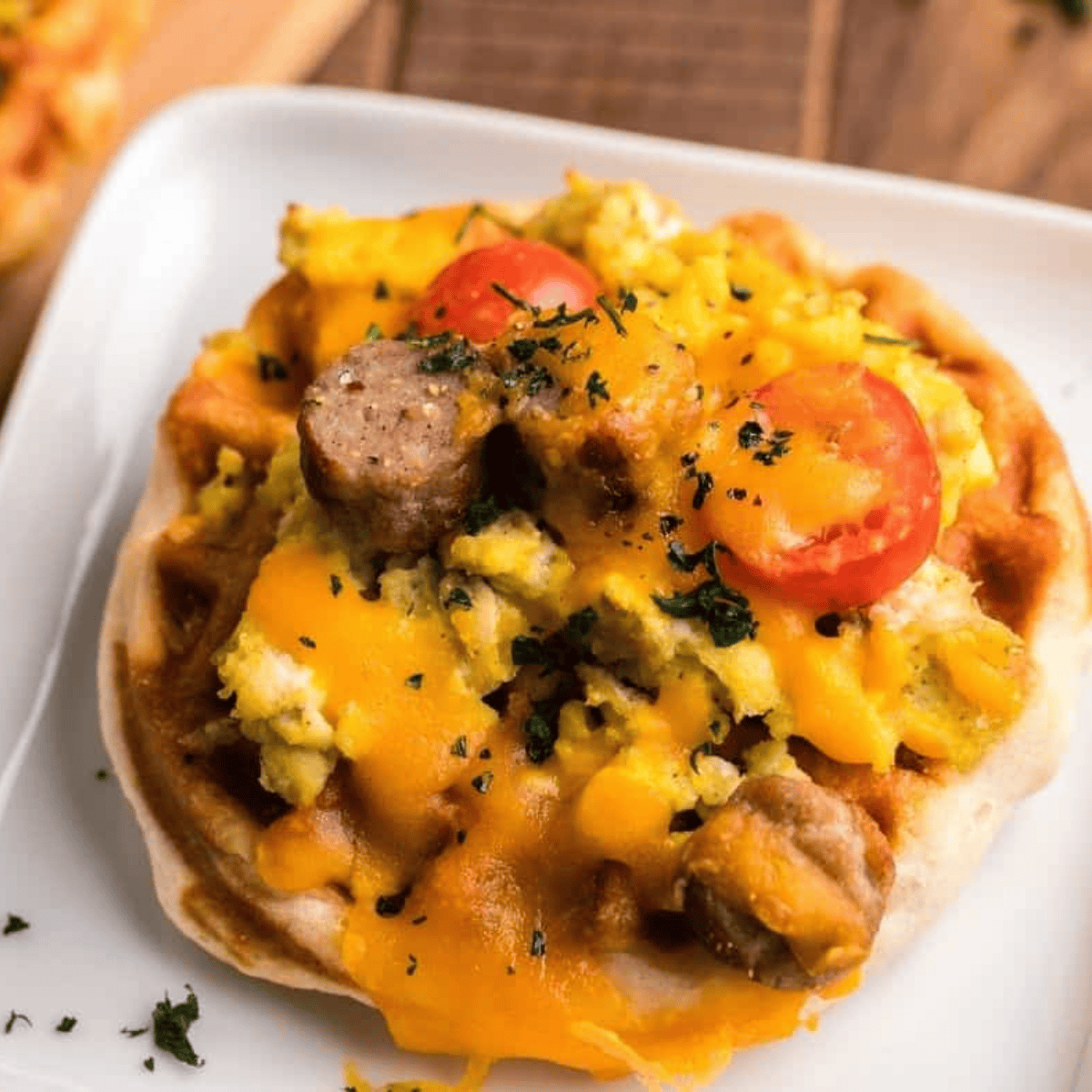- Top each waffle with scrambled eggs, 1/2 pound sausage links, and 1/2 cup cherry tomatoes. Cover with 1 cup cheddar cheese.