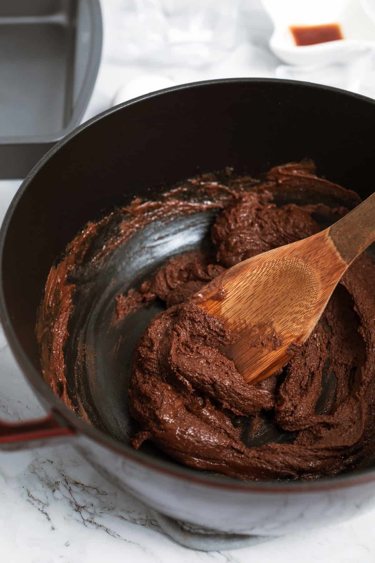 Mix wet ingredients: In a microwave-safe bowl or a small saucepan and melt the butter. Once melted, add sugar, unsweetened cocoa powder, vanilla extract, and a pinch of salt. Mix well.