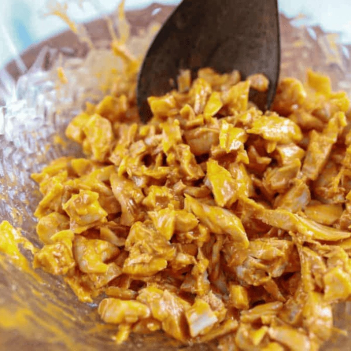 Step One: Mix the shredded chicken with buffalo sauce in a large bowl, making sure it’s well coated.