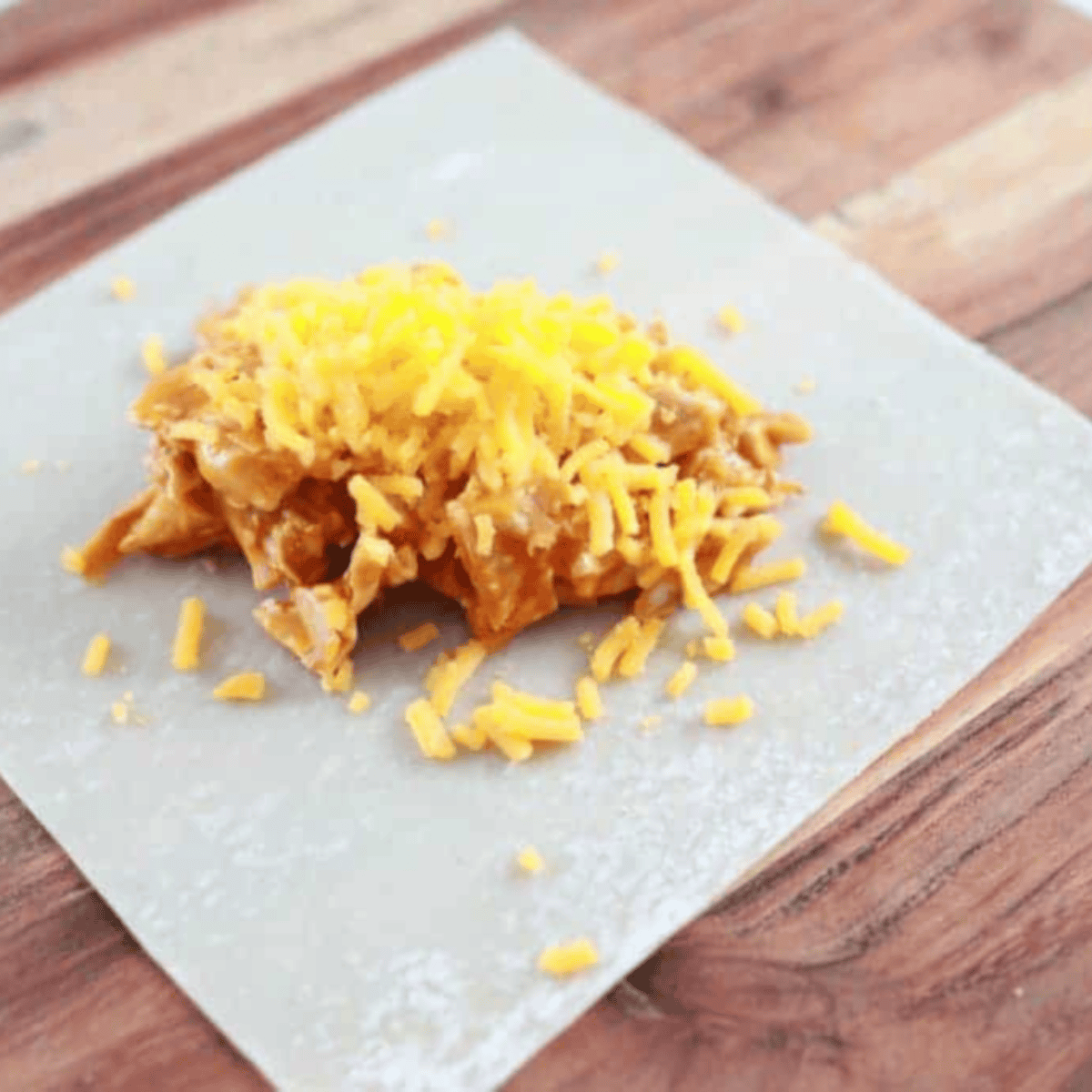 Step Two: Lay out an egg roll wrapper on a clean surface or cutting board. Place a spoonful of the buffalo chicken mixture in the center, sprinkle shredded cheese on top.