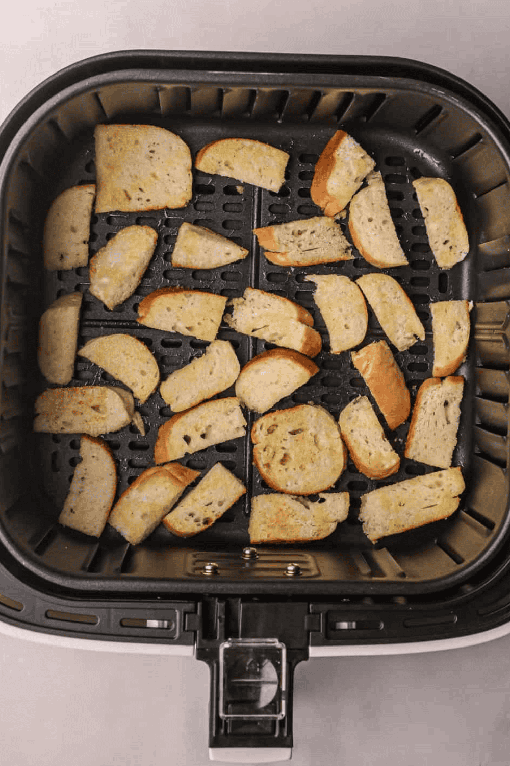 Step Three: Season the bagels with garlic powder. Arrange the slices in a single layer in the air fryer (make sure pieces aren’t overlapping) and cook at 300 degrees F for about 7-9 minutes. You may need to do 2-3 batches to cook all the slices.