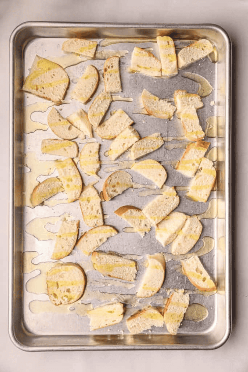 - Place the slices on a baking sheet or cutting board and coat with a thin layer of 2 tablespoons olive oil