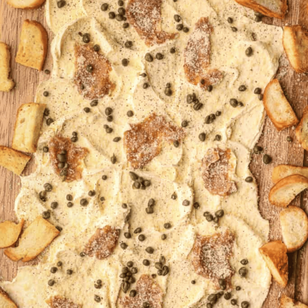 - Sprinkle 2 tablespoons parmesan cheese, 1/2 teaspoon salt, 1/2 teaspoon black pepper, and 2-3 tablespoons capers evenly over the entire board.
