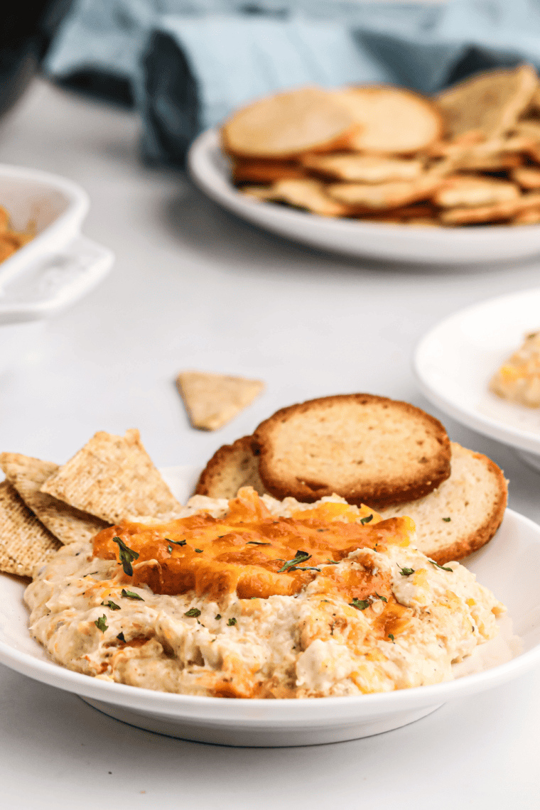 What can I serve with crab dip? Crackers, toasted baguette slices, tortilla chips, or fresh veggies all work great.