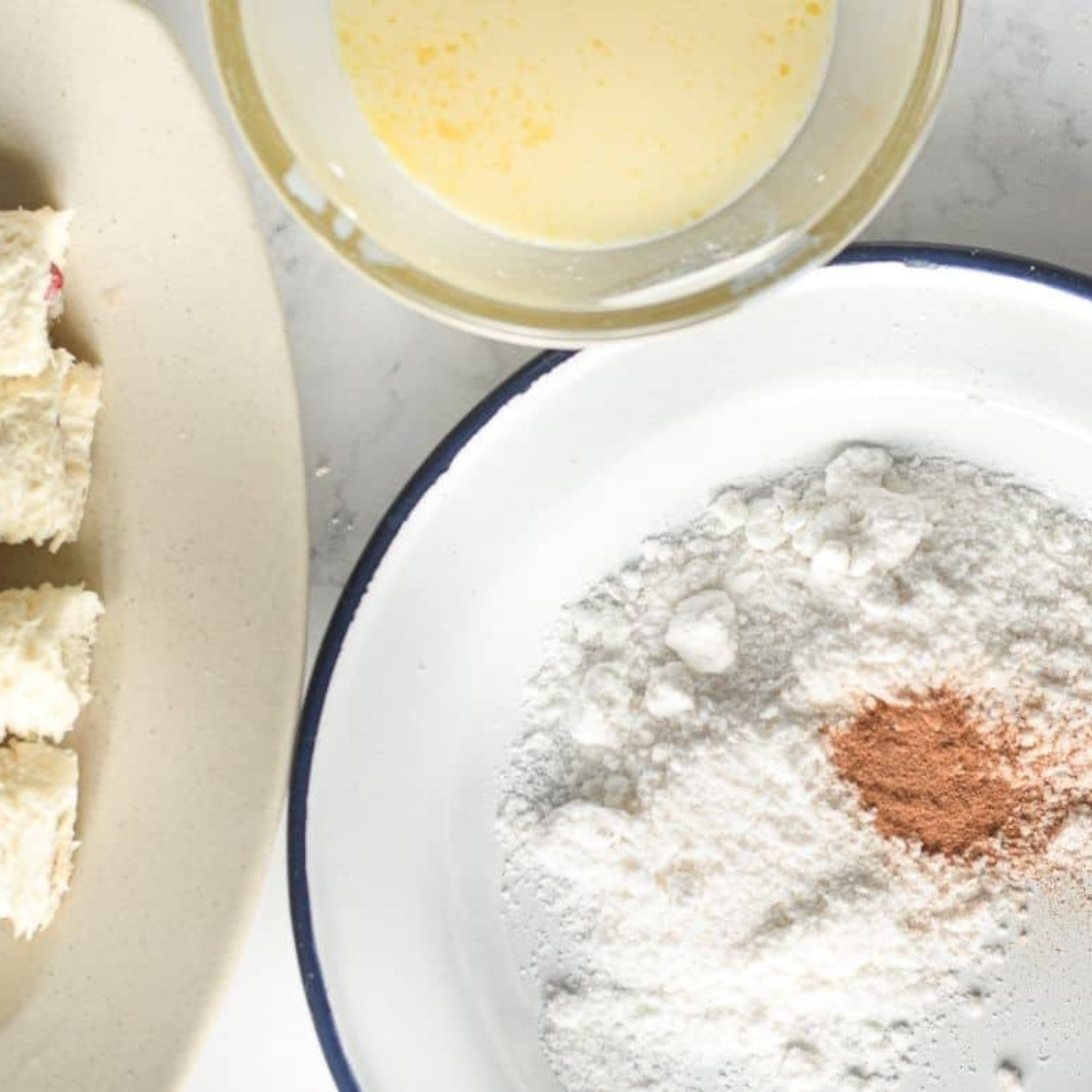 - Whisk together 2 large eggs and 2 tablespoons milk and set aside. In a small dish, mix 1/4 cup granulated sugar and 1 teaspoon ground cinnamon and set aside.