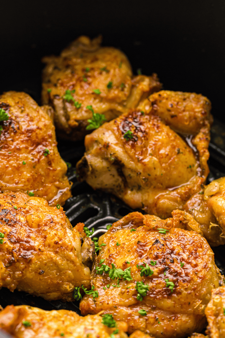 Step Four: Set your air fryer to 400°F (200°C) and let it preheat for about 5 minutes. Place the thighs in the air fryer basket skin-side down and cook for 12 minutes. Flip the thighs and cook for an additional 10–12 minutes, or until the internal temperature reaches 165°F (74°C) and the skin is golden and crispy.