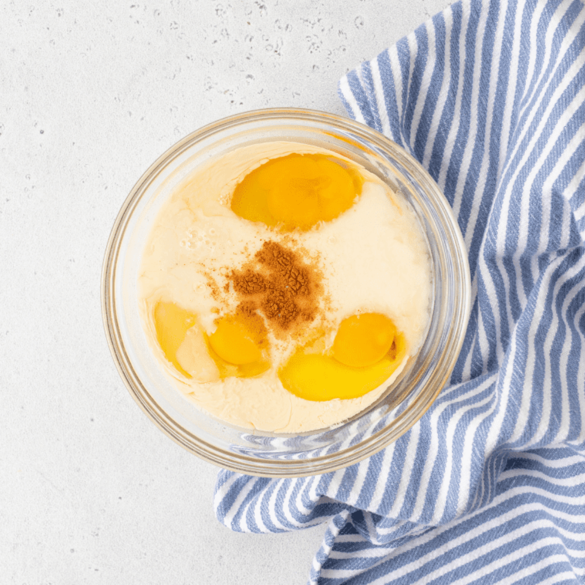 - In a large mixing bowl, mix together the 3 large eggs, 7 ounces evaporated milk 7.5 ounces unsweetened condensed milk, 1/2 tablespoon pure vanilla extract, and 1/4 teaspoon ground cinnamon, mix until smooth.