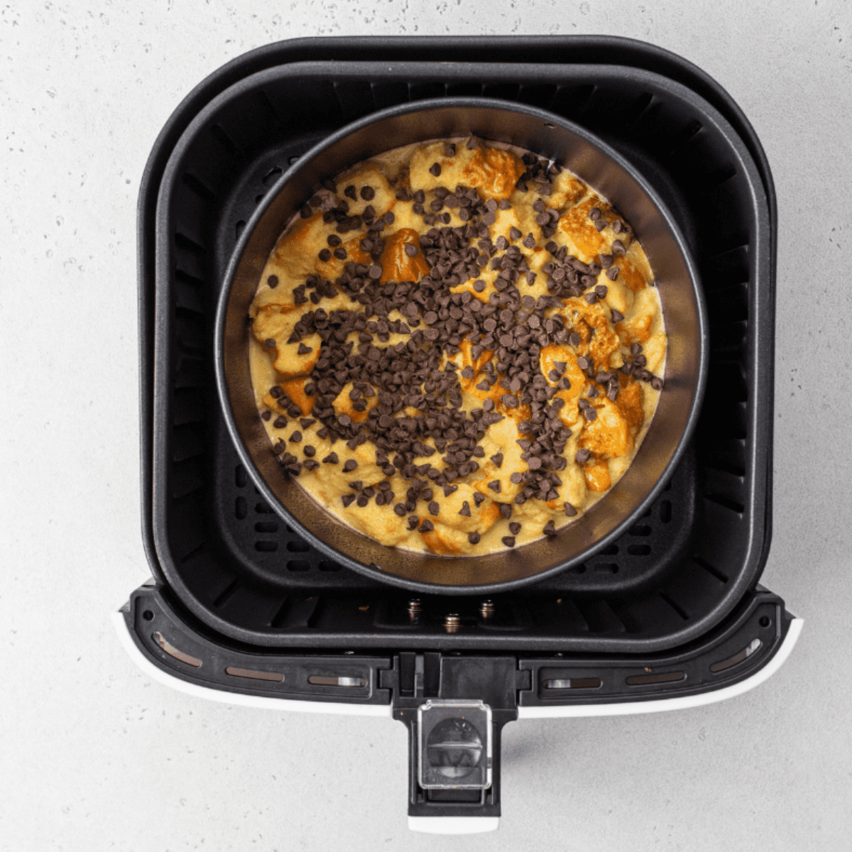 Layers of soft, custardy bread are studded with melty chocolate chips and baked to a golden, slightly crisp perfection in the air fryer.