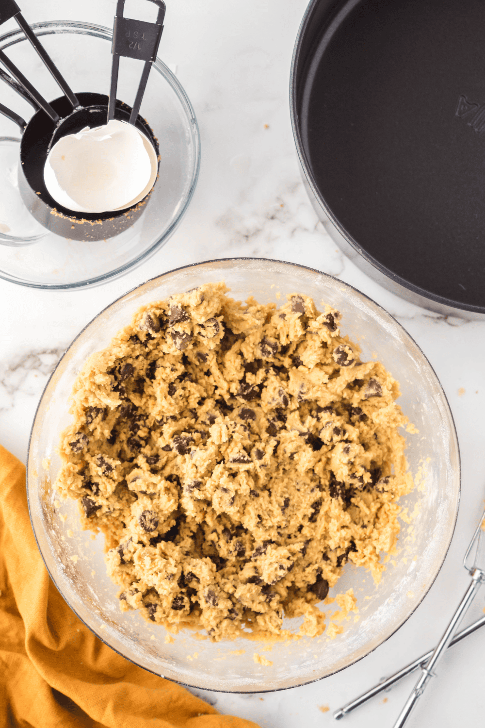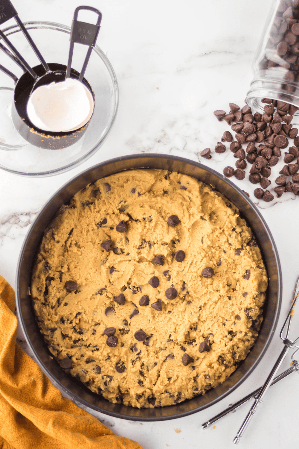 - Eggs — Eggs act as the stabilizer in your cookie dough and will help keep everything bound together as your pizookie fries.