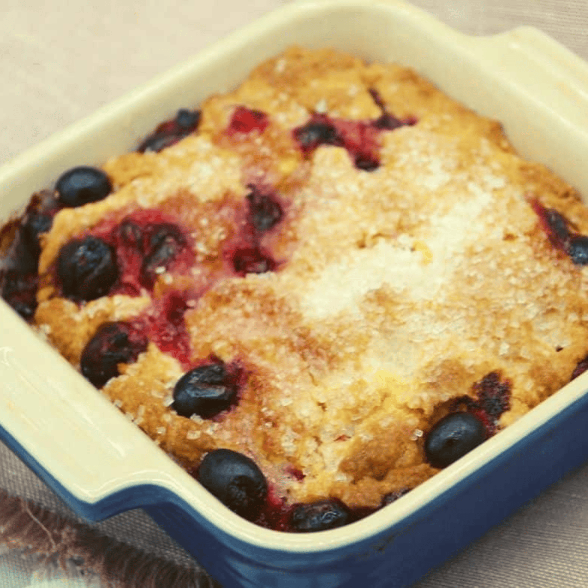 Step Three: Spray a baking dish with cooking spray, place the batter into the pan, pressing firmly, and then sprinkle some baking sugar on top (optional). Set into the air fryer for 12-15 minutes at 320 degrees F, air fryer setting.