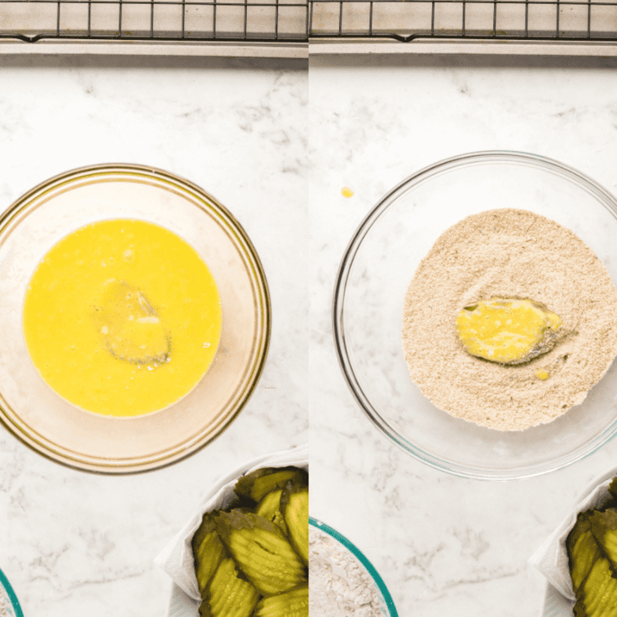 - Dredge the pickles. First, coat the pickles in flour in the first bowl. Dip into the egg and buttermilk mixture and allow excess liquid to drip off. Then, toss in the breadcrumb mixture. Press the crumbs into the pickles. Place breaded pickles onto a wire rack over a baking sheet.