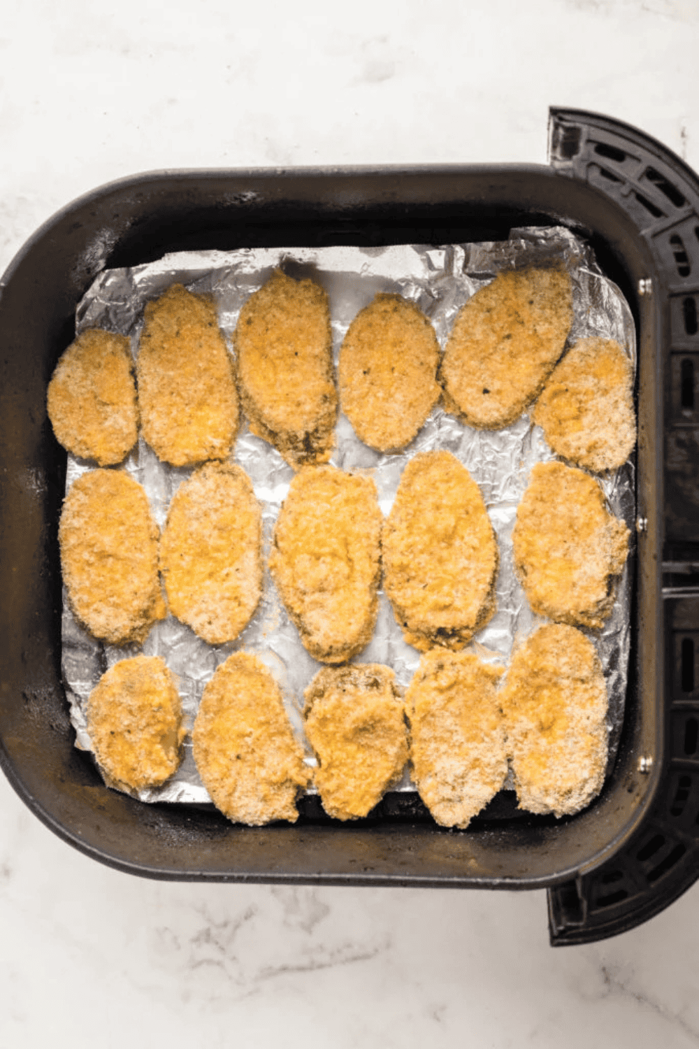 Step Four: Preheat the air fryer to 400 degrees F for 3-5 minutes. Once heated, line the basket with foil and add the pickles in a single layer. Spray lightly with canola oil and cook for 5 minutes. Flip the pickles over and spray again. Cook for 2 more minutes.
