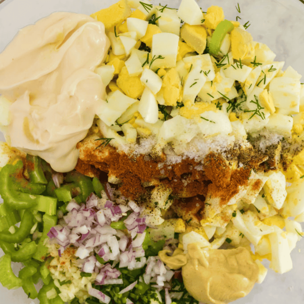 • Eggs – Hard-boiled, chopped eggs for a creamy base