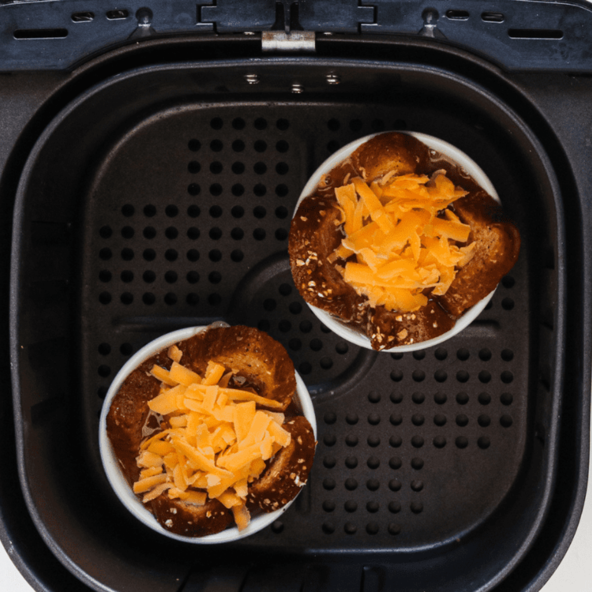 Step Three: Crack an egg into the center of the soaked bread and sprinkle shredded cheese over the top. Place the ramekins in the air fryer and cook at 330 degrees Fahrenheit for 5-7 minutes.