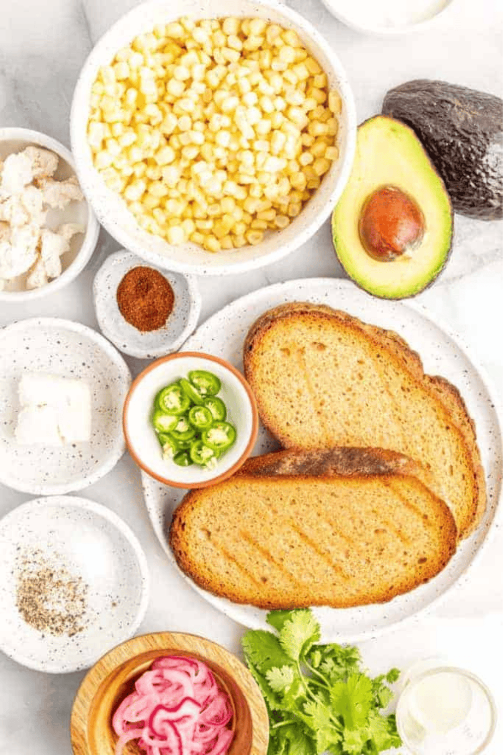 - Toast: Crispy base for avocado, corn, and toppings