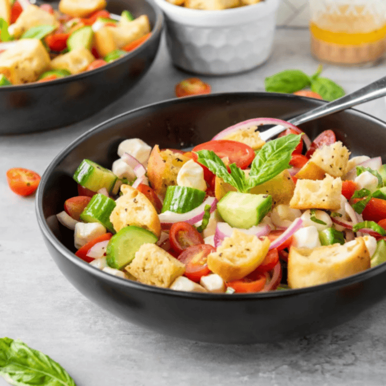 Panzanella Salads are excellent. They combine all the flavors of a salad with homemade crusty bread (think homemade croutons). They’re usually served with a light and easy vinaigrette dressing. Once you have this salad, you will be in love; it will become one of your favorite summer dishes.