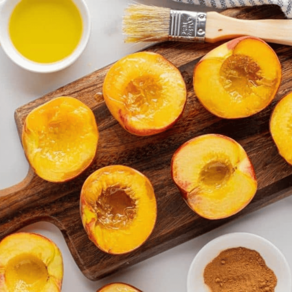 Step 2: Slice each peach in half and remove the pit using a sharp knife. Lightly brush the cut sides with olive oil.