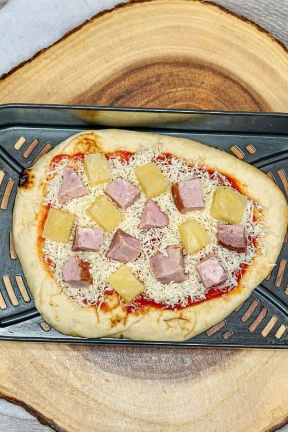 Mozzarella cheese, diced ham, and pineapple layered on naan pizza