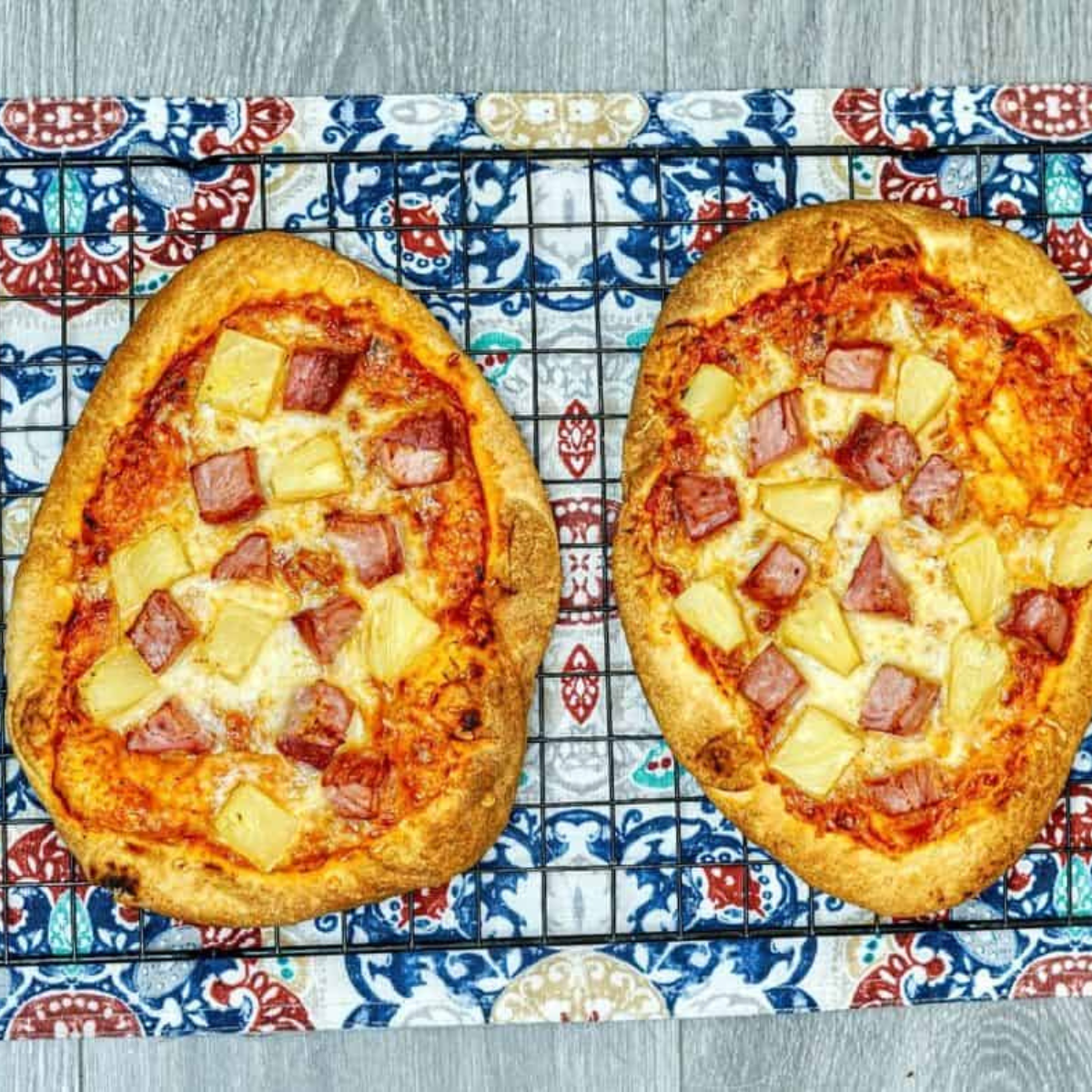 Air Fryer Hawaiian Pizza Flat Bread made with crispy naan, marinara sauce, melty mozzarella, sweet pineapple, and savory ham. An easy, family-friendly meal ready in minutes.