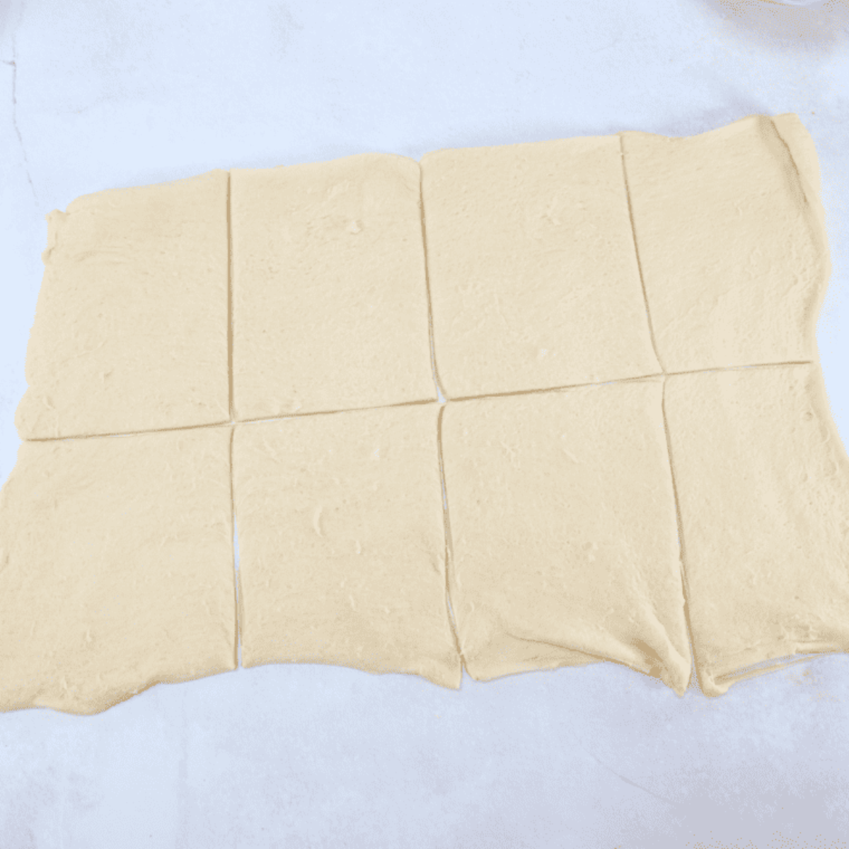 - Open your dough of Crescent Sheets, and cut them, using a pizza cutter, into 8 equal pieces.