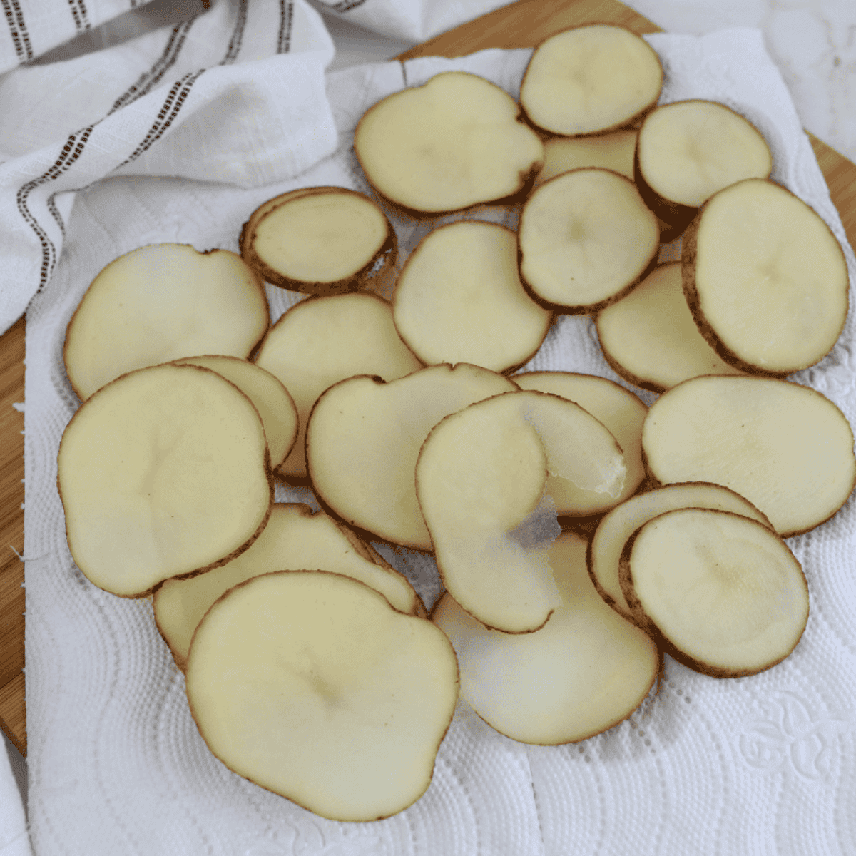 Step Three: Spread the potato slices on a paper towel-lined counter and cover with another paper towel. Let them dry for about an hour.