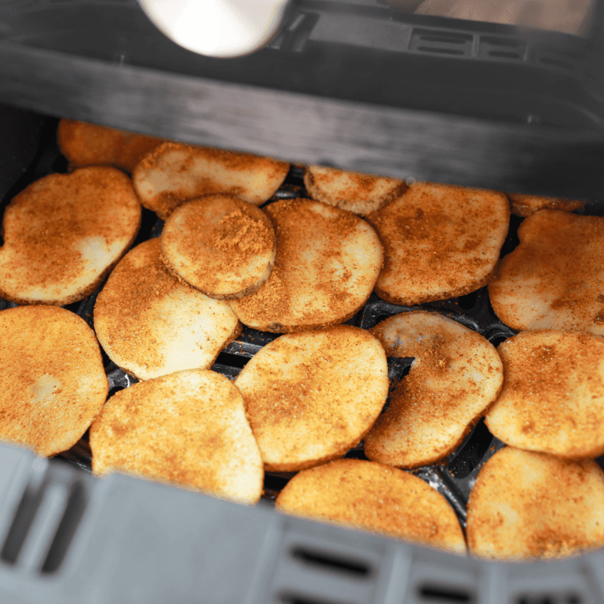 - As you coat the potato slices, arrange them on a greased air fryer tray. If using a basket-style air fryer, lightly spray the basket and place the slices on top, making sure not to overcrowd.
