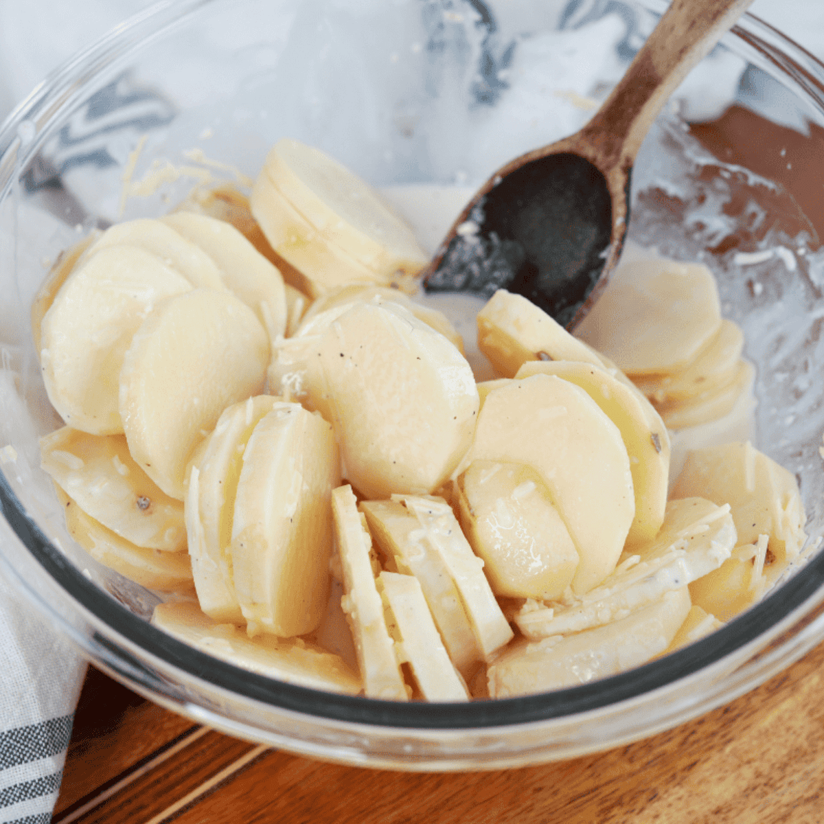Step 1: Grease your air fryer pan to prevent sticking. Wash, peel, and pat the potatoes dry, then slice them into 1/4 to 1/3-inch thick pieces and place in a large mixing bowl. Add the milk, heavy cream, Parmesan cheese, garlic, nutmeg, kosher salt, and black pepper, then toss everything together until the potatoes are fully coated in the creamy mixture.