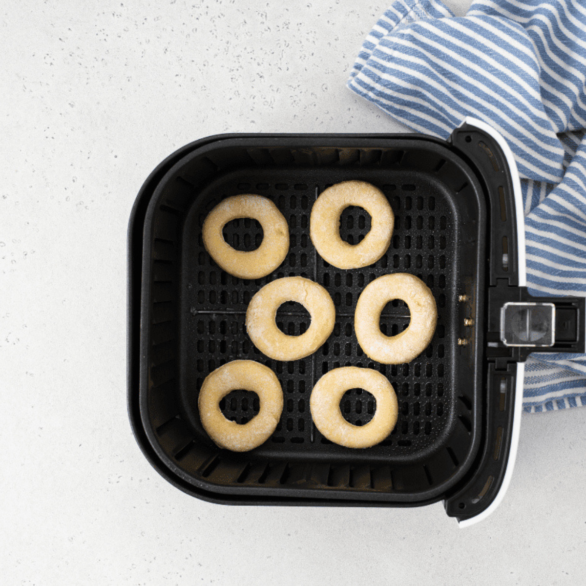 - Add the donuts to a grease air fryer tray or in the greased air fryer basket (sprayed with olive oil). Then let them rise for another 30 minutes.