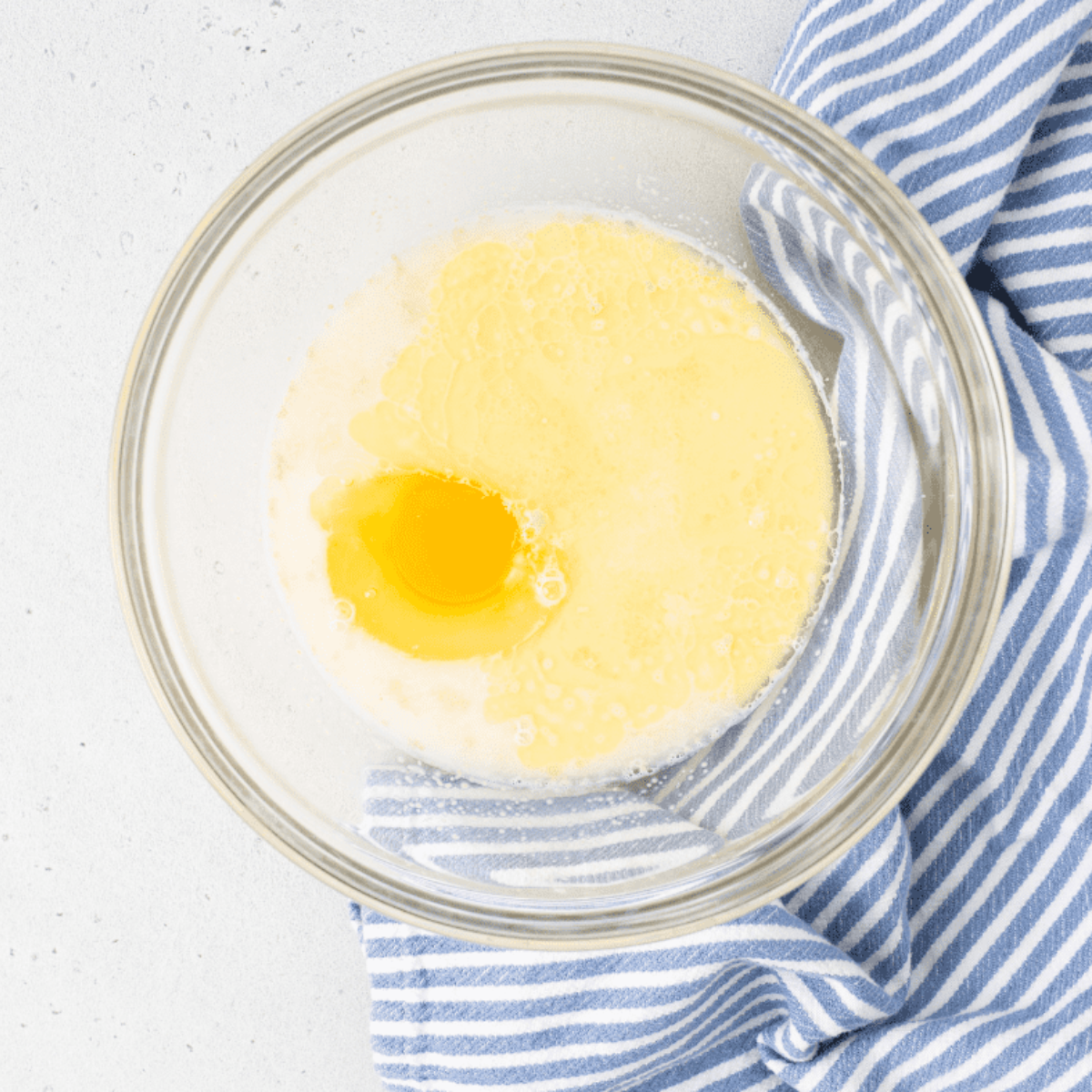 - Then add your yeast mixture to a large mixing bowl, then add in the egg, melted butter, vanilla extract, and salt.
