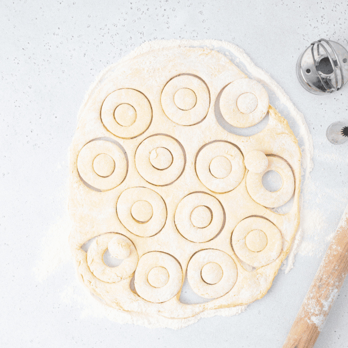 Once the dough has risen, turn it onto a lightly floured surface and roll out to about 1/4-inch thick. Use large biscuit cutters to cut out each donut, then a smaller one to create the hole in the middle. Continue until you have cut out all of your dough.
