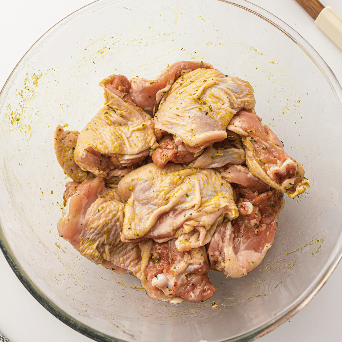 Step 4: Place the coated chicken thighs in a single layer in your air fryer basket. Set the air fryer temperature to 360 degrees F and set cook time for 18–20 minutes, flipping halfway through, until the chicken is fully cooked and crispy on the edges.